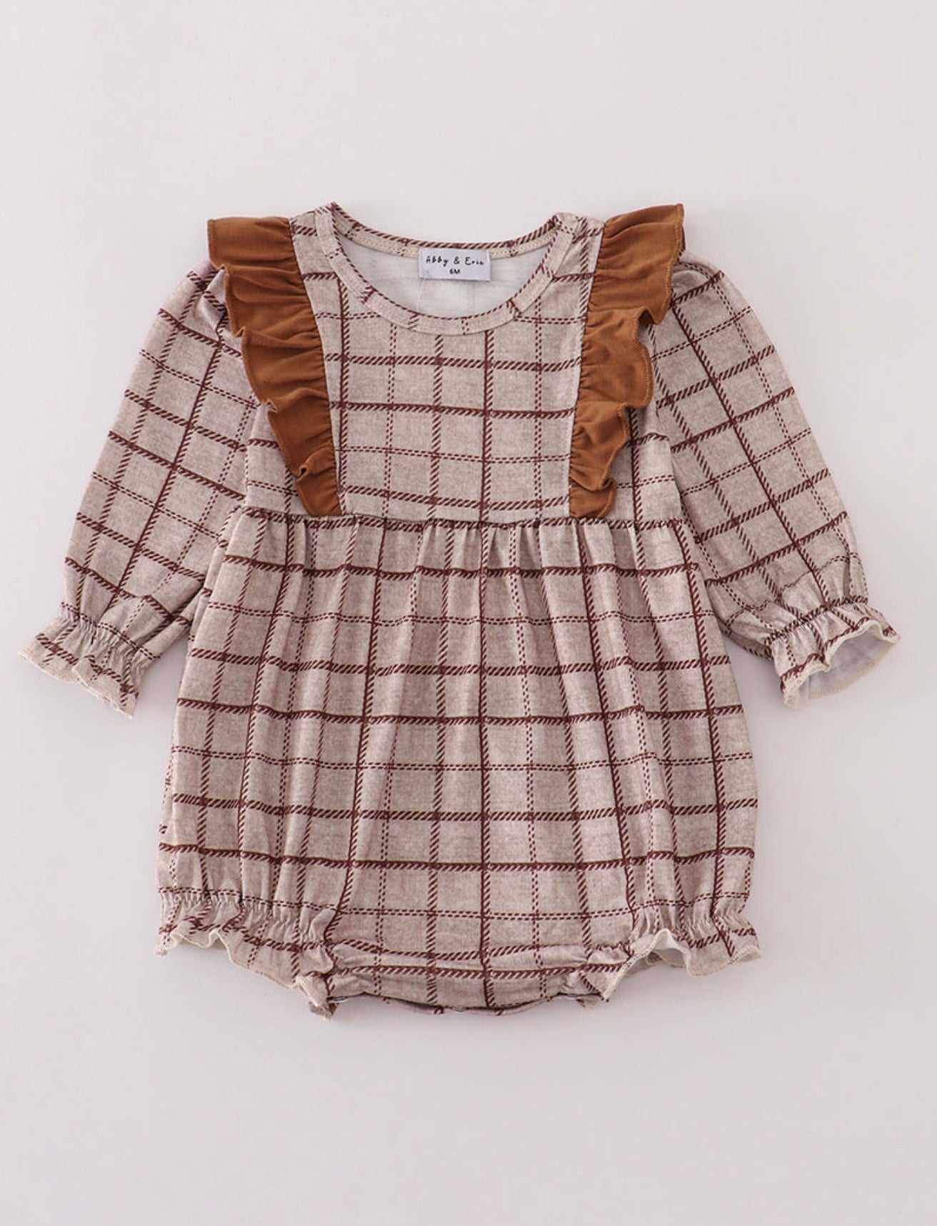 Add a touch of whimsy to your little one's wardrobe with this brown plaid ruffle bubble romper. Featuring charming ruffle details and a cozy bubble silhouette, it's perfect for playful days and sweet adventures. Soft, stylish, and easy to wear, this piece brings classic plaid into a fun, fresh look.
