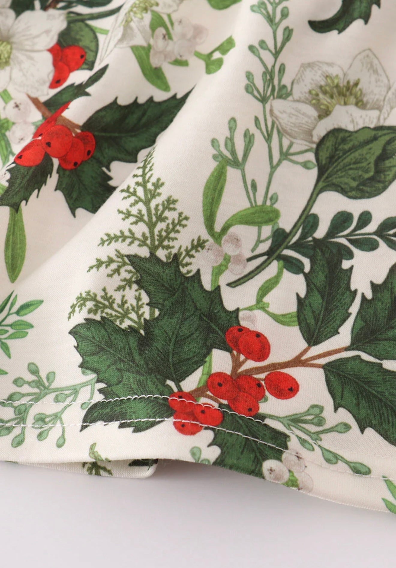 Step into a whimsical world with this green holly floral smocked dress. Its playful smocked bodice hugs you comfortably while the vibrant holly print adds a festive, cheerful touch. Perfect for sunny days or holiday gatherings, this dress brings a fresh burst of nature-inspired charm to your wardrobe.