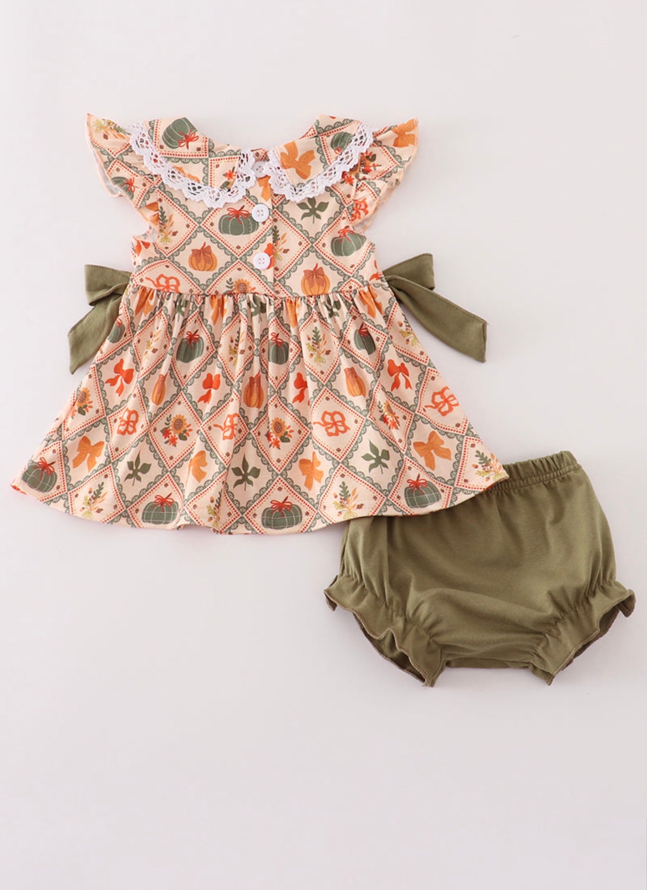 Dress your little one in adorable charm with this green pumpkin bow print bloomer set. Featuring a playful pumpkin pattern and cute bow details, it's perfect for sunny days and festive fun. Soft, comfortable fabric ensures all-day wearability while adding a touch of whimsy to any outfit.