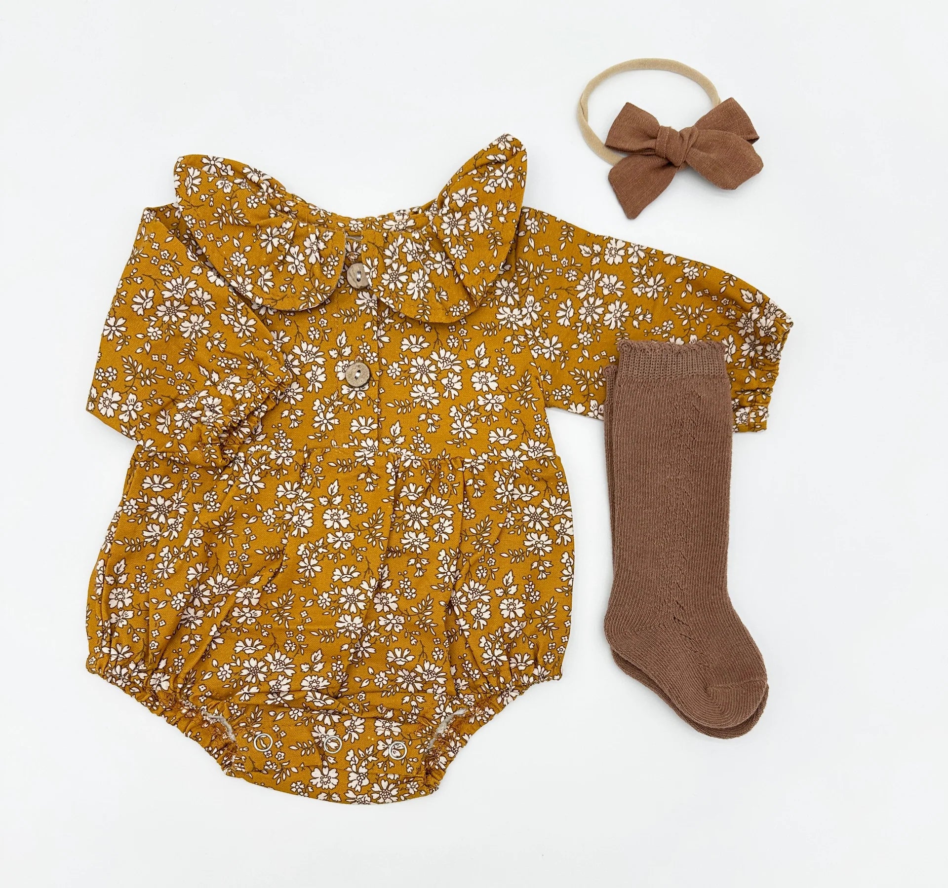 Elegant and vibrant long-sleeved cotton mustard floral bodysuit is the perfect dressy one-piece outfit for your baby's first photos or their special fall season outfit at the pumpkin patch.