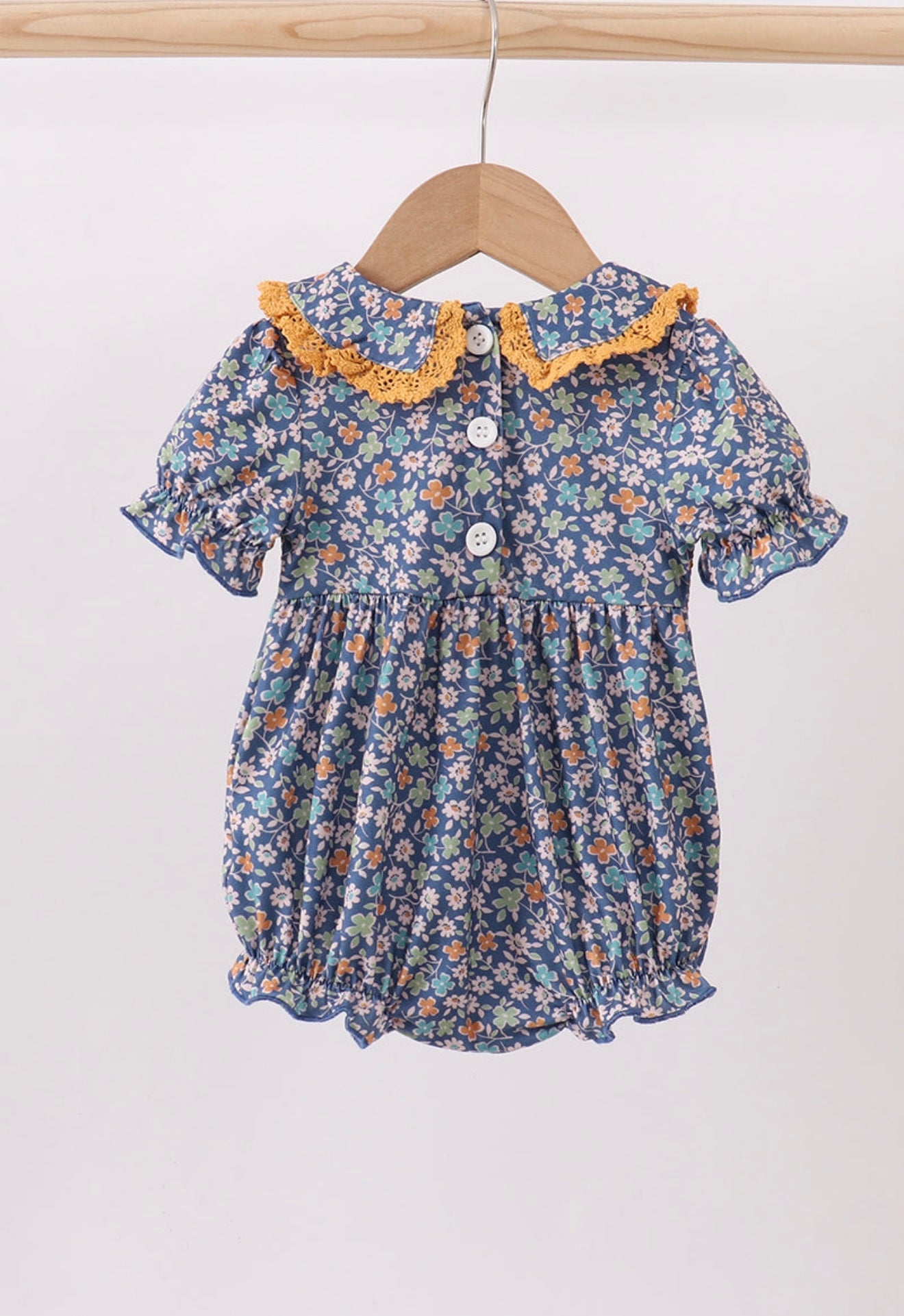 This navy floral smocked ruffle bubble brings a fresh, fun vibe to any little one's wardrobe. The smocked bodice offers a comfy, stretchy fit while delicate ruffles add charming flair. Perfect for playdates or special occasions, this playful piece combines sweet floral patterns with a bubbly silhouette for effortless style and comfort.