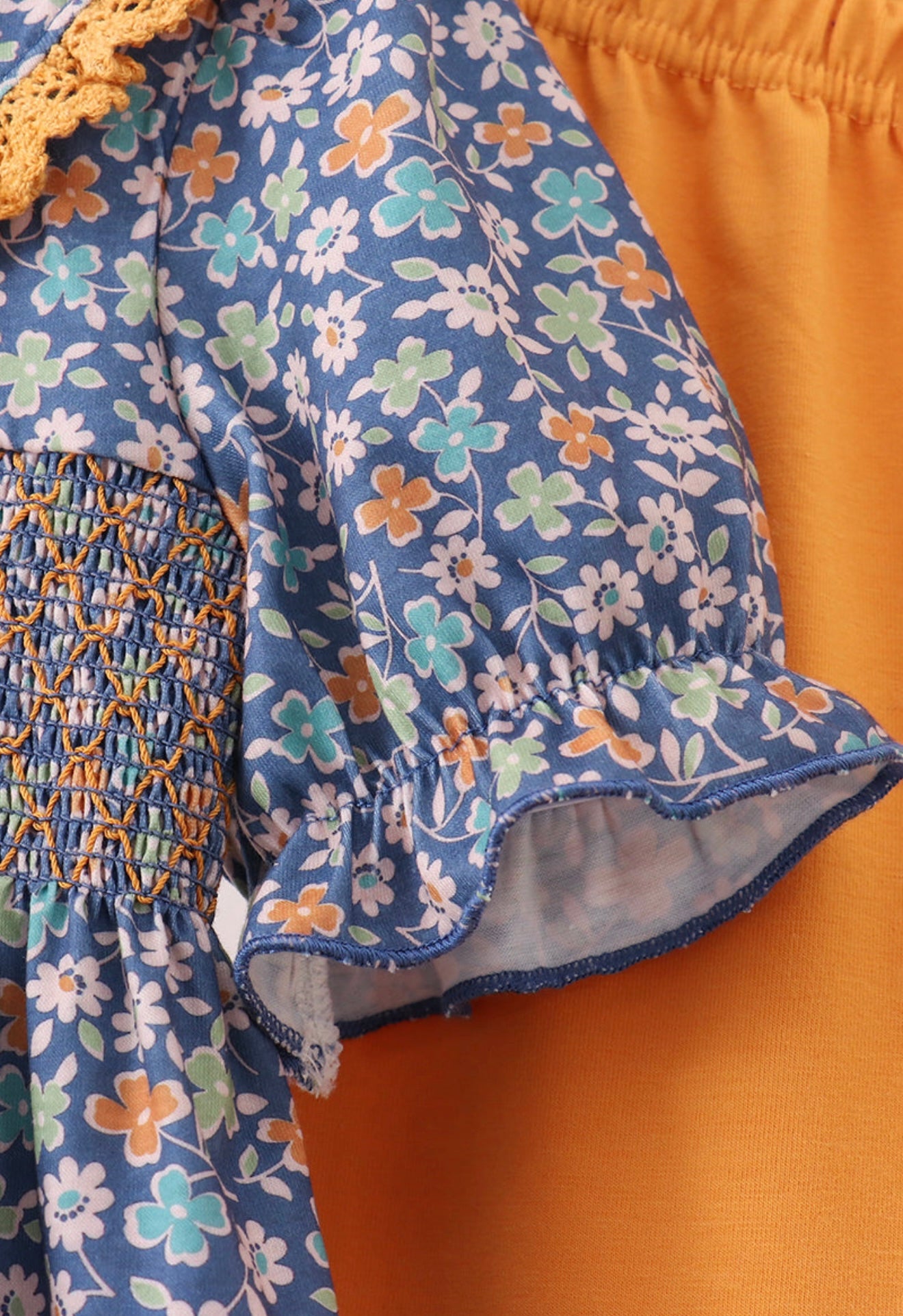This navy floral smocked ruffle pants set brings a playful twist to your wardrobe with its charming smocked detailing and flirty ruffles. Designed for comfort and style, it's perfect for twirling through sunny days or adding a splash of fun to any casual occasion. Embrace effortless, cheerful fashion with this delightful set that pairs floral freshness and playful texture seamlessly.