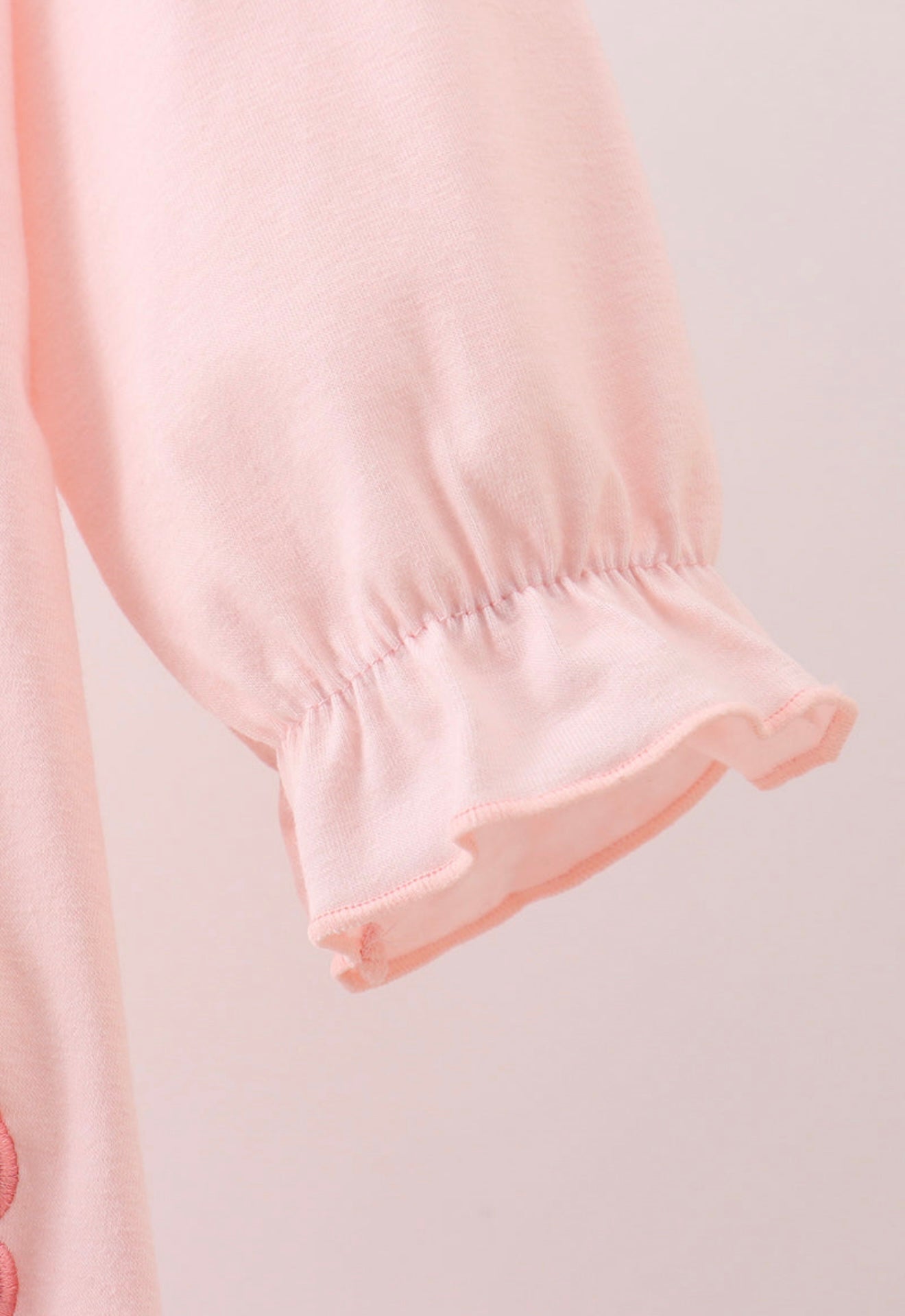 This pink dress brings a touch of whimsy with its delicate floral bow applique and charming ruffle details. Perfect for playful days and special occasions, it combines sweet style with a fun, flirty vibe that's sure to brighten any wardrobe.
