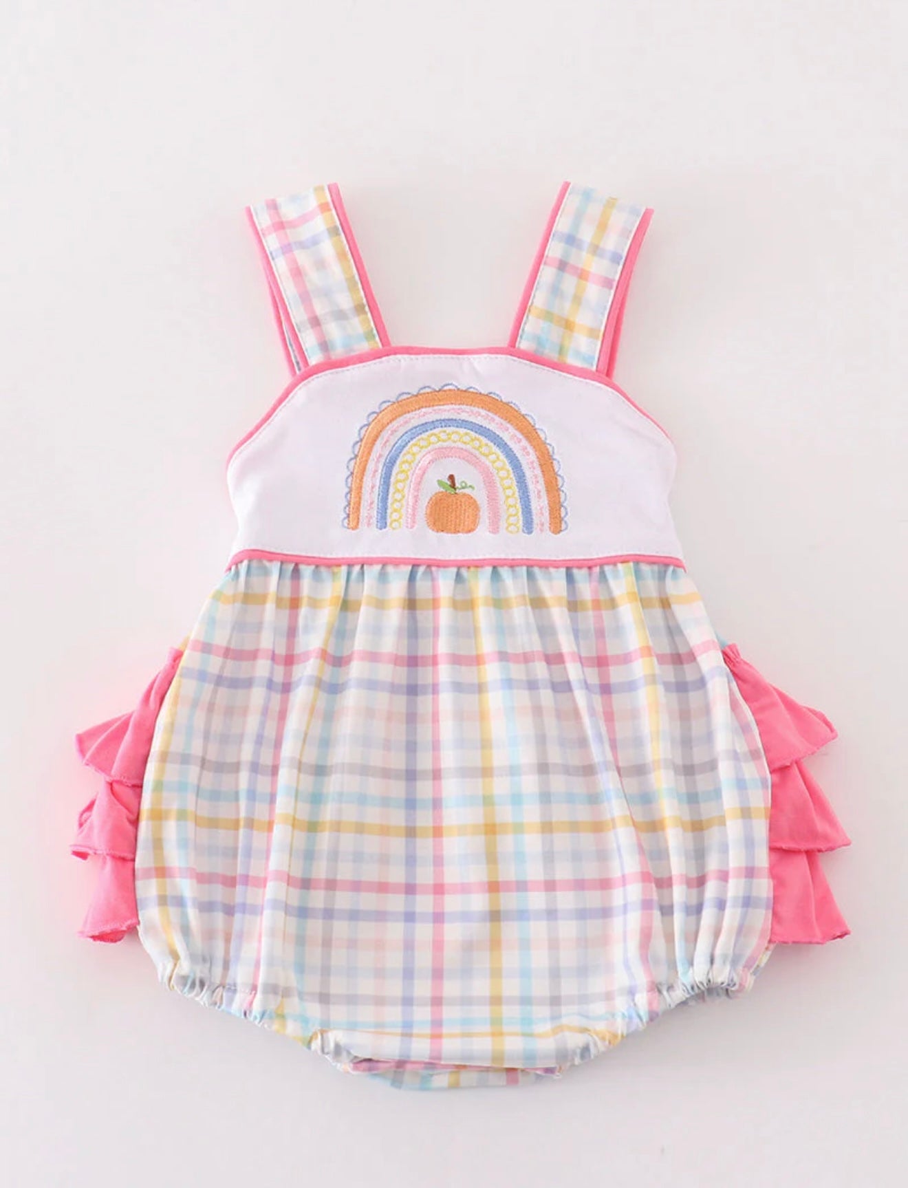 Add some colorful fun to your little girl's wardrobe with this playfully embroidered plaid bubble! This unique rainbow pumpkin design is sure to make her stand out, while the comfortable plaid fabric keeps her stylish and comfortable all day long. Perfect for playdates, parties, or everyday wear.