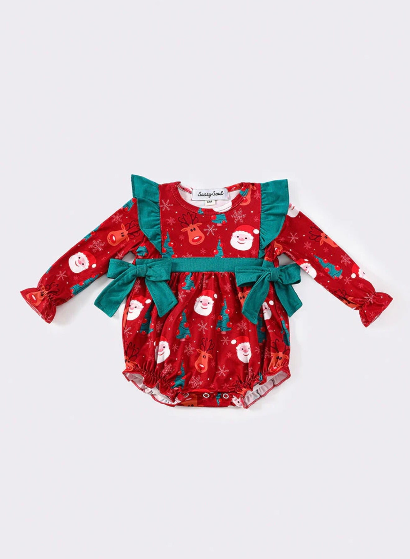 Get into the holiday spirit with this red ruffled bubble featuring a jolly Santa Claus print. Perfect for festive gatherings and family photos, this playful piece will have you ho-ho-ho-ing all season long!