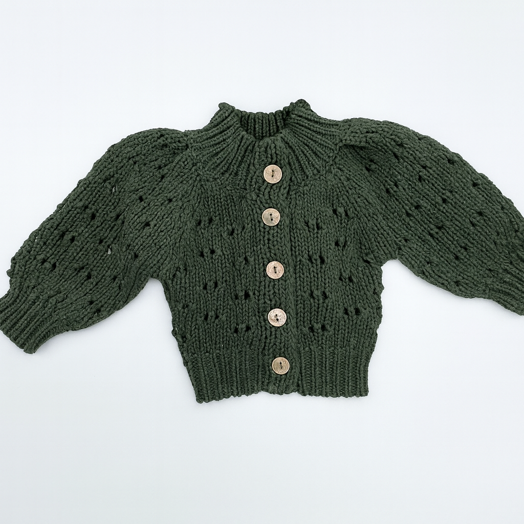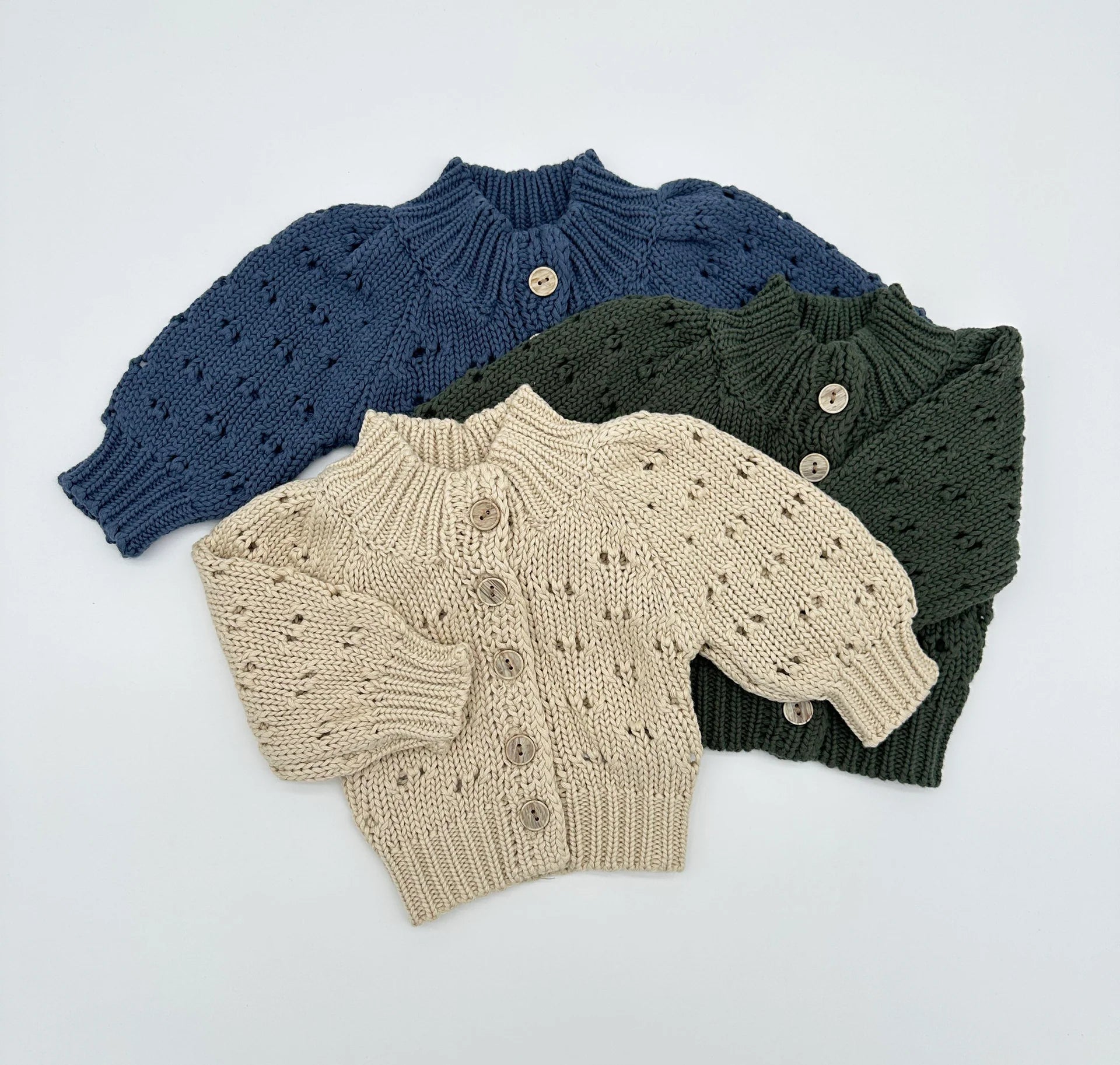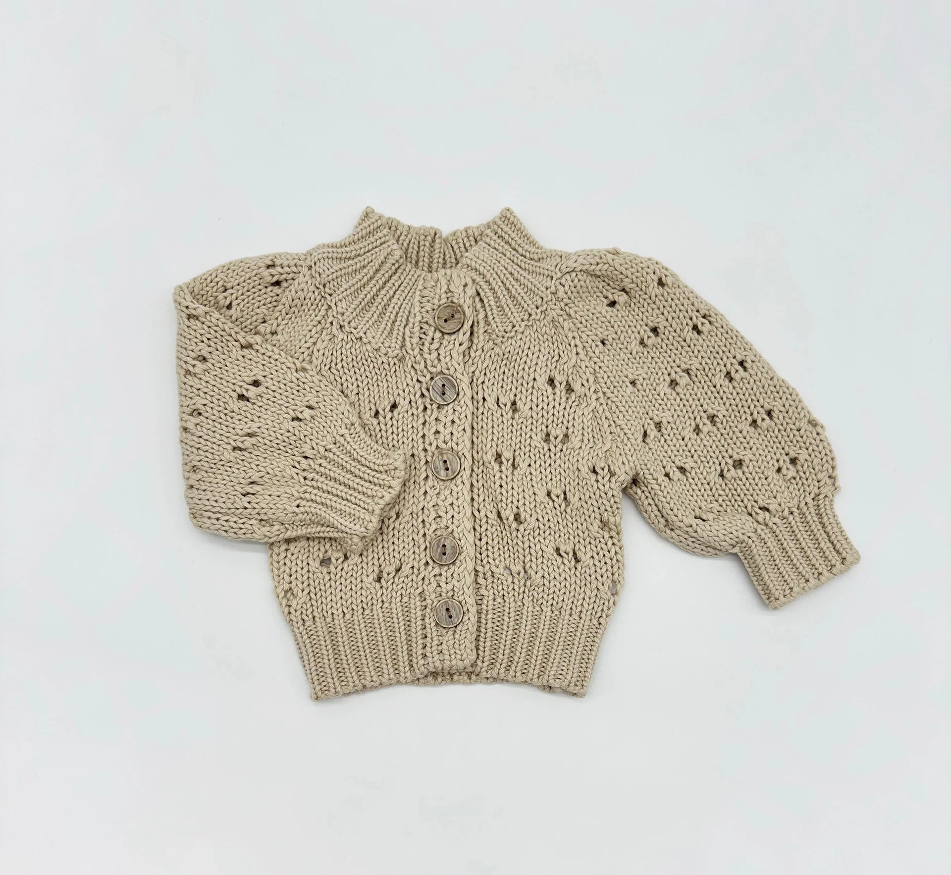 Cozy, timeless, and beautifully detailed — our Teddy Pointelle Baby Cardigan is crafted from ultra-soft 100% cotton yarn, perfect for layering in every season. Featuring a classic pointelle knit pattern, wooden buttons, and a ribbed collar and cuffs, this sweater blends vintage charm with everyday practicality.