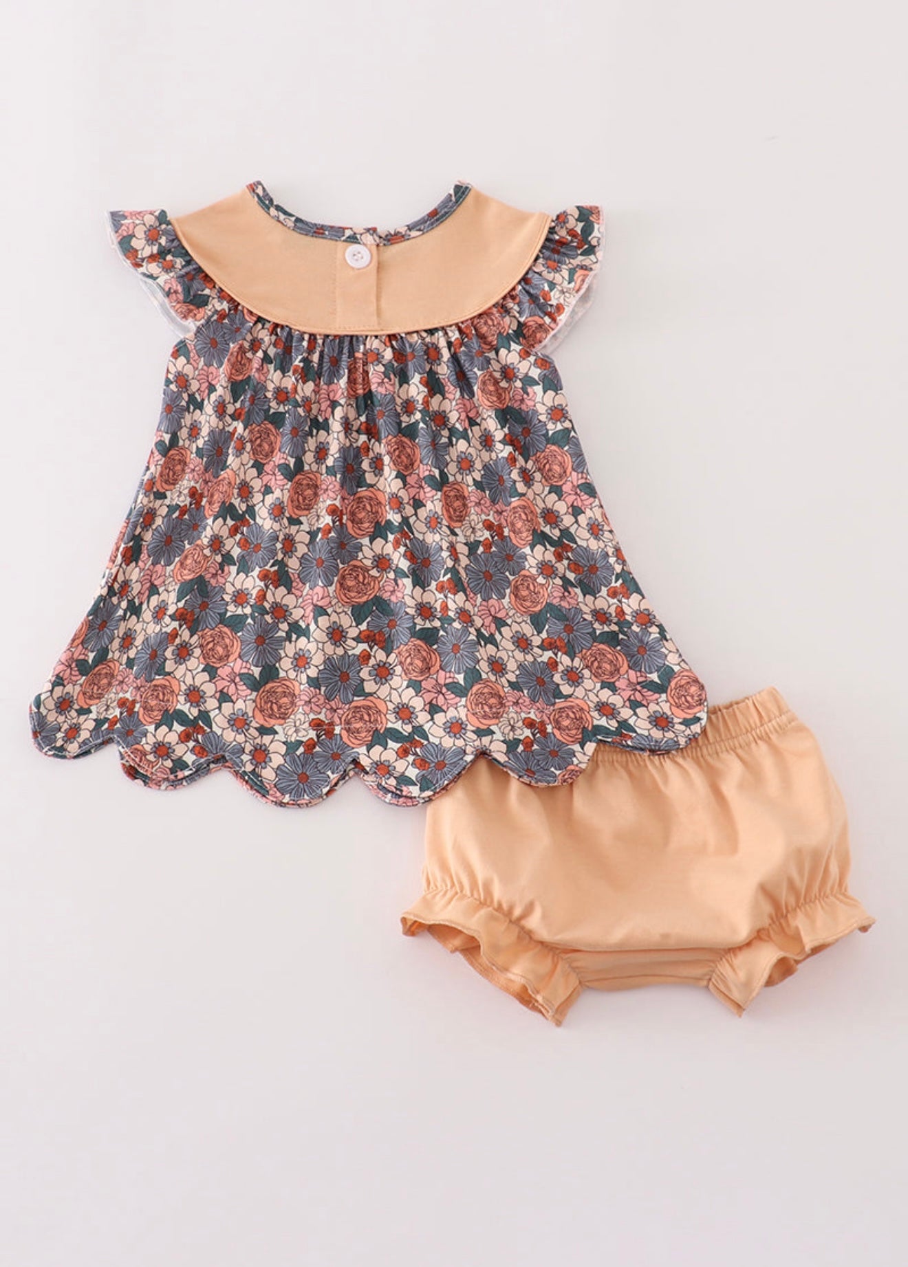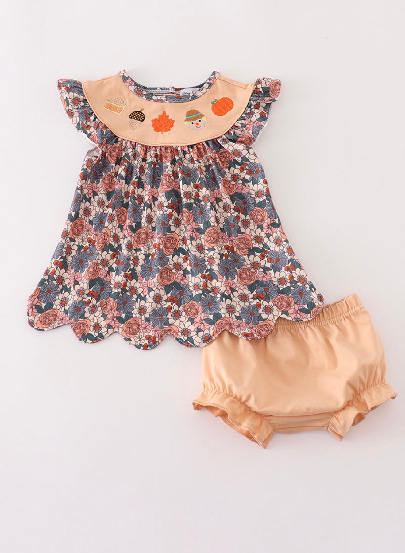 Celebrate the cozy season with this playful top and bloomer set featuring charming fall floral prints and adorable pumpkin embroidery. Its light, airy design adds a whimsical touch to your autumn wardrobe, perfect for embracing the spirit of fall with fun and flair.