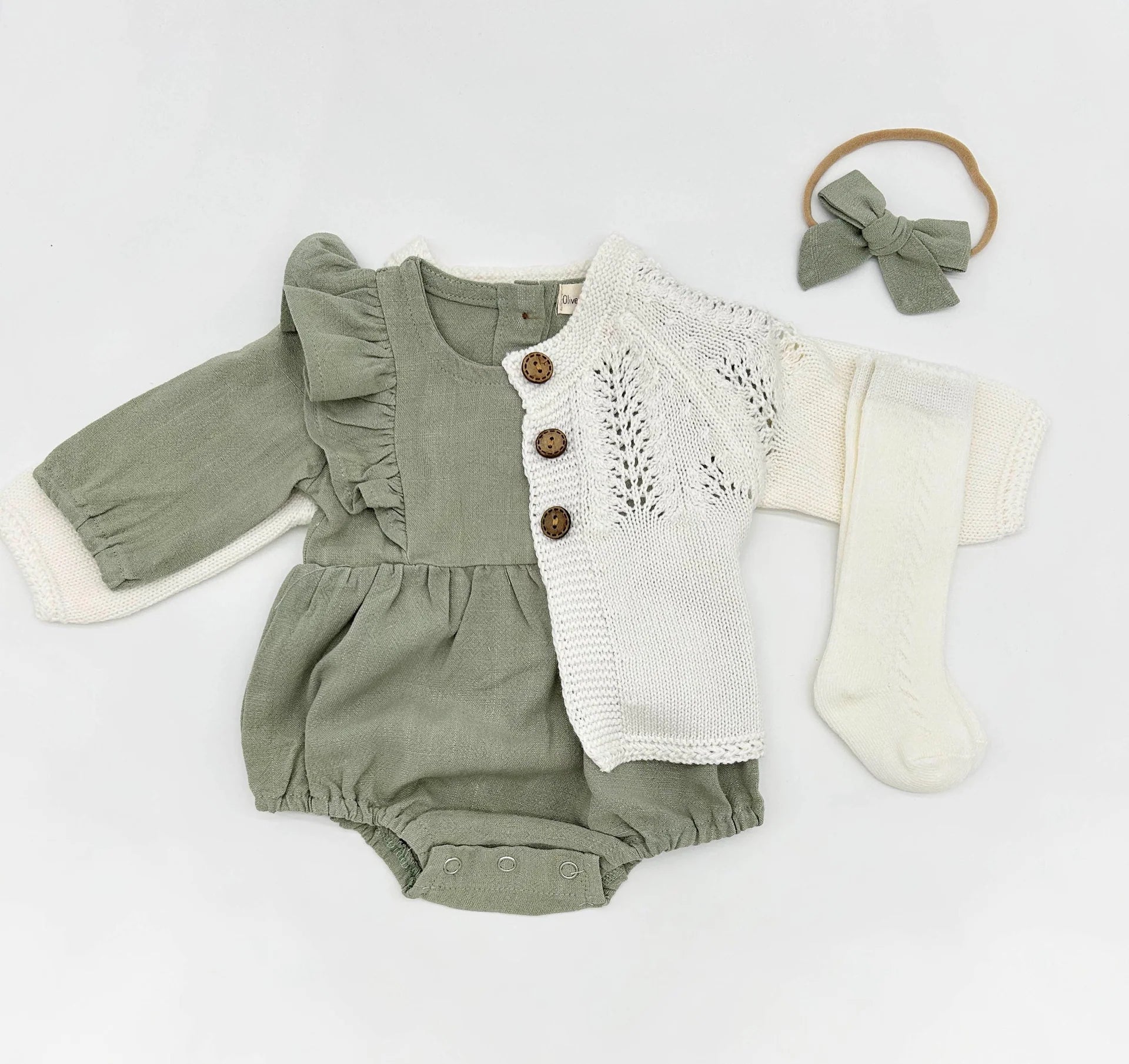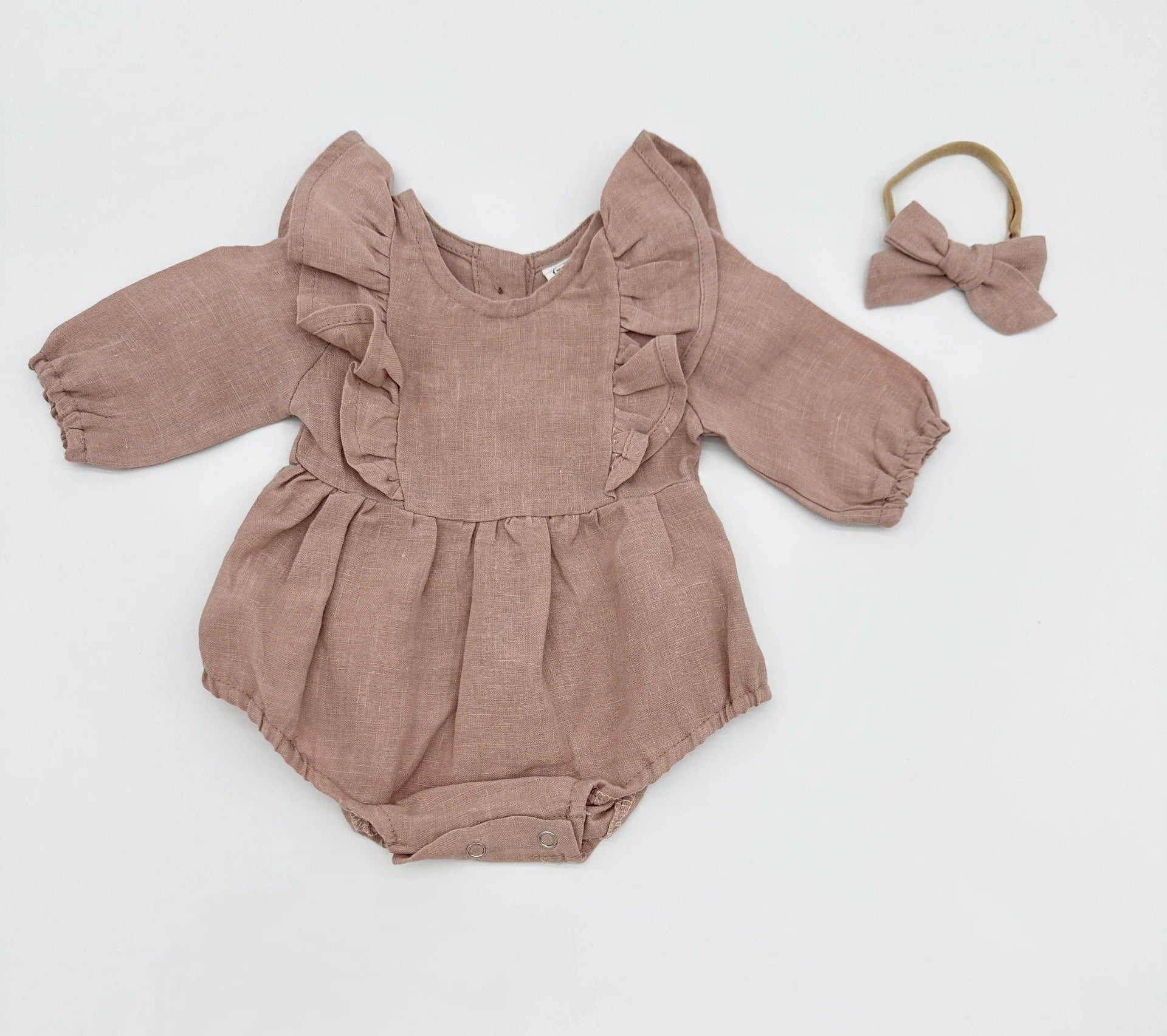 The Gabriella long-sleeved linen romper is an elegant ruffle collar romper made from 100% linen and elegant wooden buttons on the back.