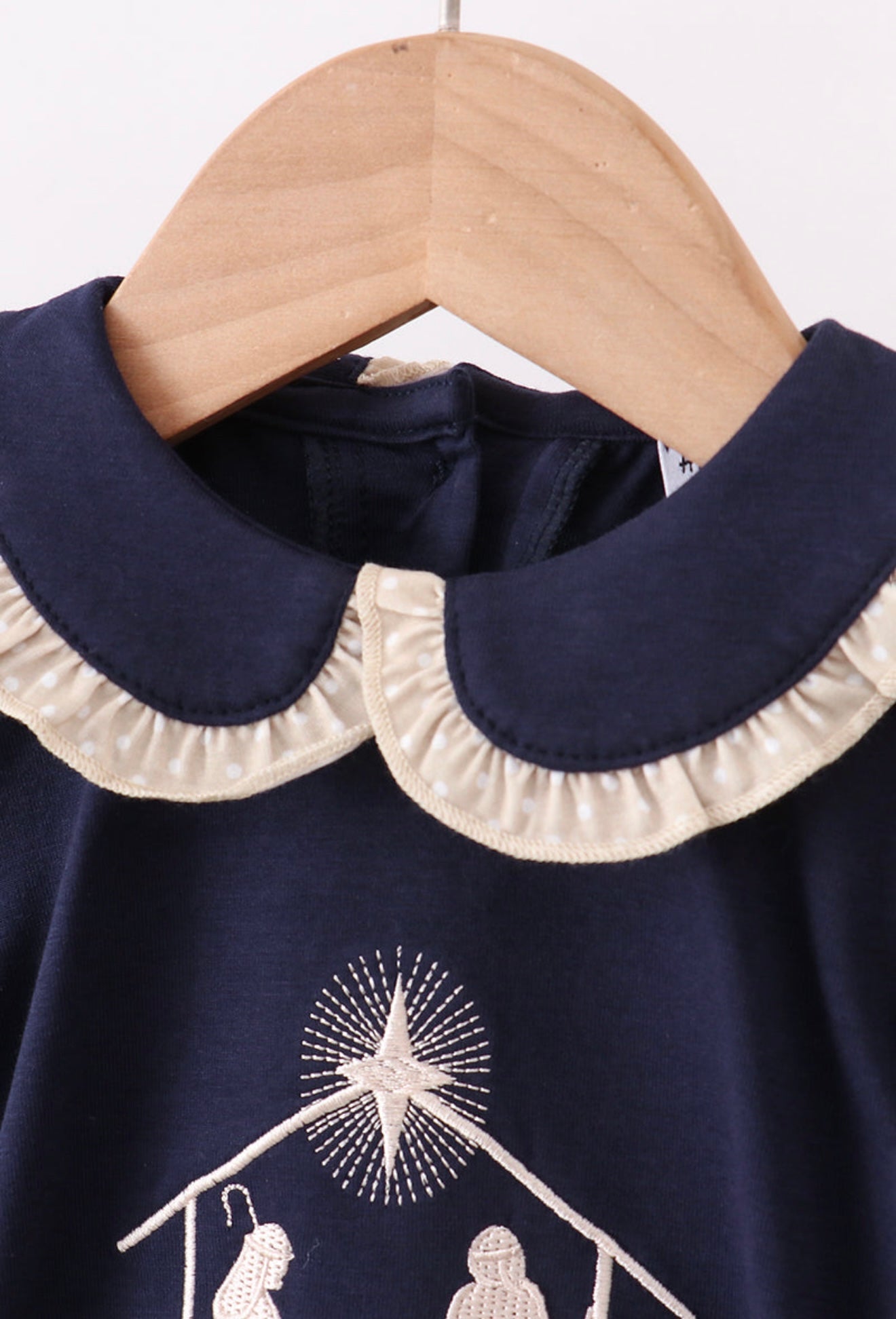Navy nativity “Oh Holy Night” embroidery ruffle bubble